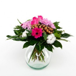 Weihnachtlicher Strauss in den Trendfarben lila-rosa mit Rosen, Germini, Chrysanthemen und einer Weihnachtskugel.