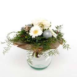 Edler Strauss in weiss mit Rose, Gerberas und weihnachtlichem Grün. Die eingearbeiteten Zapfen und Glitzerkugeln verleihen dem Strauss den weihnachtlichen Touch!