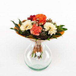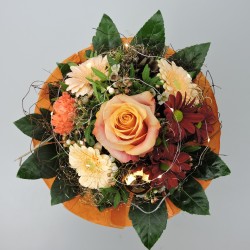 Weihnachtlicher Strauss in schönen Kupfer Farben mit Rosen, Germini, Kugeln und Zapfen. Verpackt in einer trendigen Kupferpapiermanschette. Dieser leuchtende Strauss bringt Weihnachtliche Stimmung in jeden Haushalt. (Neu: mit und ohne Lichterkette möglich)